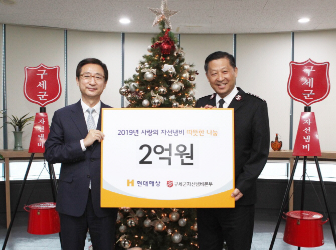 | | 현대해상은 지난 9일 구세군에 불우이웃돕기 성금 2억원을 전달했다. 성금 전달 후 조용일 현대해상 총괄 사장(왼쪽)과 김필수 구세군 사령관이 기념촬영을 했다. (사진= 현대해상) |