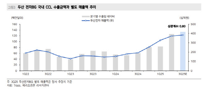 양 연구원은 “ 반대로 NV사 주요 밸류체인이 4분기를 출하 정점으로 제시하고 있는 만큼, 전자BG 또한 이에 상응하는 가파른 반등세가 예상된다”며 “GB300 역시 동사가 Computing Tray용 CCL을 단독으로 공급하기 때문에, 다른 NV사 밸류체인 대비 뚜렷한 우상향 실적 흐름이 기대된다”고 했다.