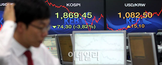 [이데일리 한대욱 기자] 미국 국가신용등급 강등 악재로 코스피 지수가 전일 대비 74.30p(3.82%) 내린 1869.45로 장을 마친 가운데 8일 오후 서울 중구 외환은행 딜링룸에서 딜러들이 분주히 움직이고 있다.