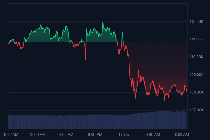 글로벌 가상자산 시황중계 사이트 코인마켓캡에 따르면 17일 오전 8시 34분 기준 비트코인 가격은 24시간 전 대비 2.07% 하락한 10만 8262달러를 기록했다. 일주일 전과 비교하면 10% 넘게 하락했다. 같은 시간 이더리움은 전일 대비 2.54% 하락한 3886달러를 기록했다.