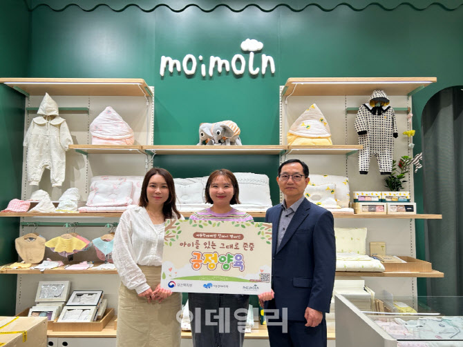 | | 김미경 모이몰른 사업부장, 차희경 모이몰른 디자인실 대리, 임동환 한세엠케이 대표 이사가 긍정양육 릴레이 캠페인 참여 기념사진을 촬영했다. (사진=한세엠케이) |