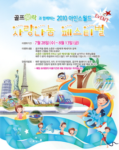 프리미엄 부킹사이트 `골프락`(www.golfrock.co.kr)은 오는 8월13일(금)까지 부천 아인스월드에서 골프락 사이트에 가입한 무료회원을 대상으로 골프락과 함께 하는 `2010 아인스월드 사랑나눔 페스티벌` 이벤트를 진행한다.