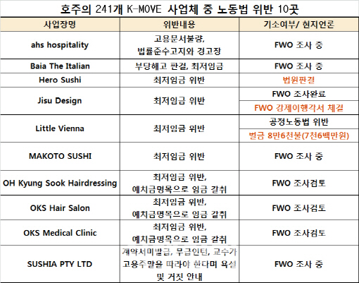 이번에 밝혀진 10곳 중 3곳은 호주의 정부기구인 ‘공정노동옴부즈만’(FWO)의 조사 결과 ‘공정노동법’(FWA) 위반으로 연방순회법원에 제소돼 이미 벌금형 등 처벌을 받은 곳이다. 나머지 7곳도 제제대상 혹은 조사대상으로 분류돼 있다. FWO는 근로감독청에 해당하는 기구다.