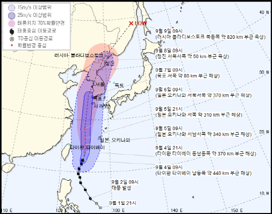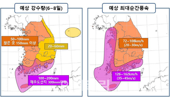 태풍의 영향으로 6일 제주도를 시작으로 7일 새벽에 전국으로 비가 확대될 전망이다. 태풍과 가장 인접하는 시기인 △6일 밤 제주도 △7일 오전 남부지방 △오후 서쪽지방엔 시간당 30mm 이상의 매우 강한 비가 내리겠고 최대 300mm 이상의 많은 비가 오는 곳도 있겠다. △남해안·지리산 부근·제주도·서해 5도는 100~200mm △중부지방·전라도는 50~100mm △강원 영동·경상도·울릉도·독도는 20~60mm 비가 올 것으로 예보됐다.