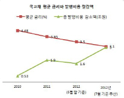 국고채 발행비용은 금리 인상기와 인하기에 따라 등락을 보이기 마련이다. 금리인하기였던 2009년 국고채 발행물량은 85조원으로 전년대비 33조원이나 늘었지만 국고채 평균금리가 4.64%로 전년 5.37%에 비해 떨어지면서 2조4000억원의 이자를 아꼈다.