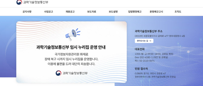 과기정통부 관계자는 “임시 홈페이지 개통을 통해 국민의 불편을 최소화하는 한편, 관계기관과 긴밀히 협력하여 과기정통부 대표 홈페이지를 신속히 복구하겠다”고 밝혔다.