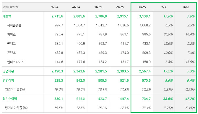 3분기 연결 매출액은 서치플랫폼, 커머스 등 주요 사업 부문이 AI 접목 효과로 견조한 성장을 이어가며, 전년동기 대비 15.6%, 전분기 대비 7.6% 증가한 3조1381억원을 달성했다.