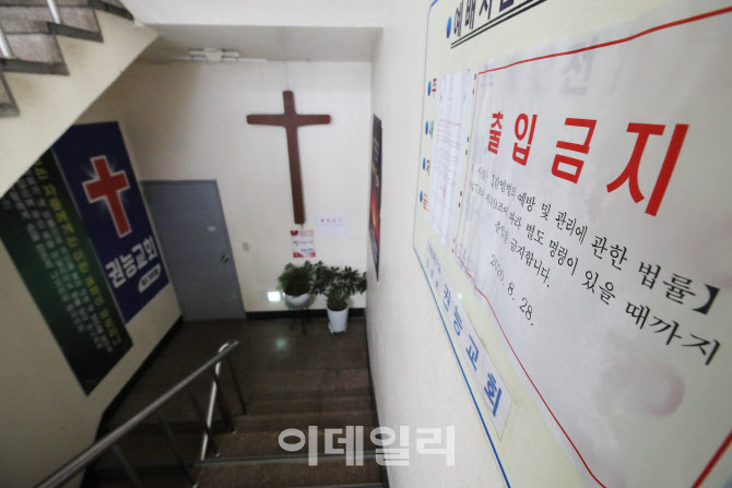 | | [이데일리 이영훈 기자] 지난달 31일 오후 서울 영등포구 당산동 권능교회가 폐쇄조치로 출입금지 안내문이 붙어 있다. |