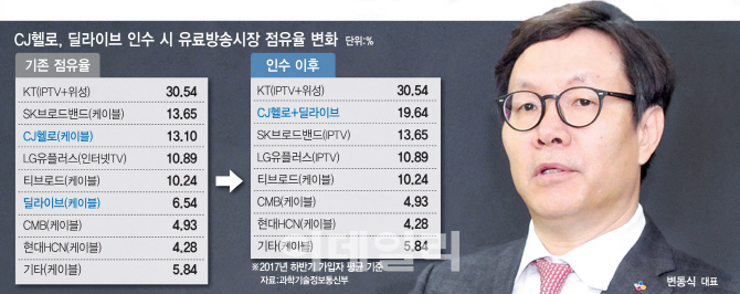 이런 상황에서 두 회사는 혈맹을 통해 몸집을 키우자는데 ‘기본적으로’ 합의했다. 2017년 하반기 기준 CJ헬로의 유료방송시장 점유율은 13.10%, 딜라이브는 6.54%로 합치면 19.64%가 돼 KT군(KT와 KT스카이라이프)의 30.54%에는 한참 뒤떨어지지만 SK브로드밴드(13.65%)는 훌쩍 앞선다.