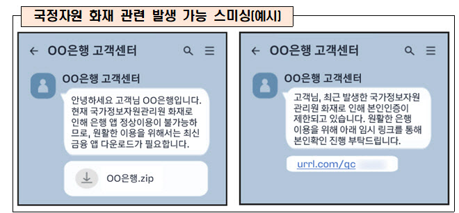 앞서 2022년 카카오 데이터센터 화재 발생 당시 카카오톡 설치파일을 위장한 악성 앱 유포, 사용자 확인을 빌미로 피싱사이트를 통한 정보입력 요구 등의 스미싱 수법이 기승을 부렸다.