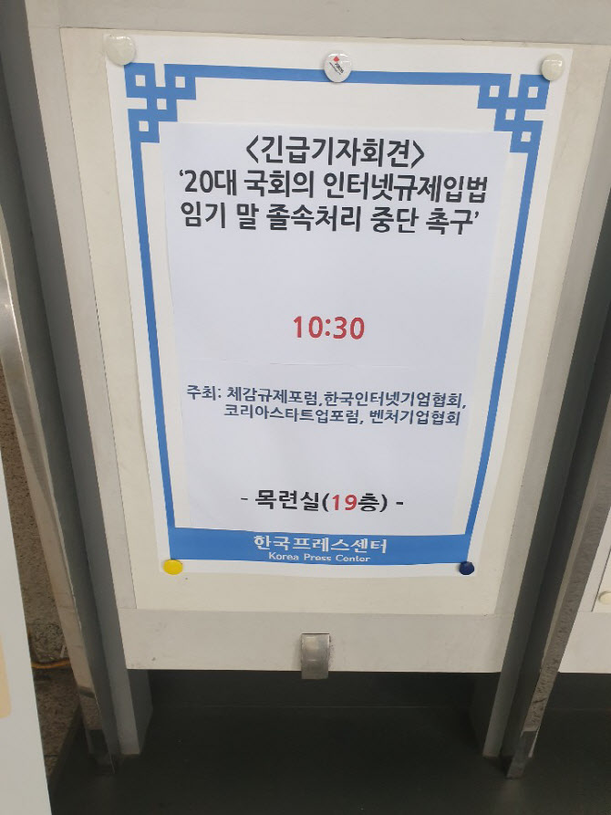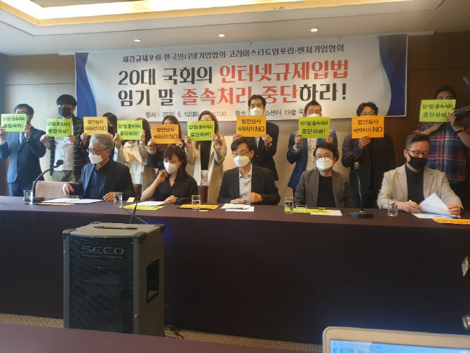 12일 오전 한국인터넷기업협회, 체감규제포럼, 코리아스타트업포럼, 벤처기업협회 등 4단체가 프레스센터에서 최근 국회 상임위(과방위)를 통과한 ‘인터넷 규제법(전기통신사업법·정보통신망법)’에 대해 법사위와 본회의에서 처리 중단을 촉구하는 기자회견을 열었다.