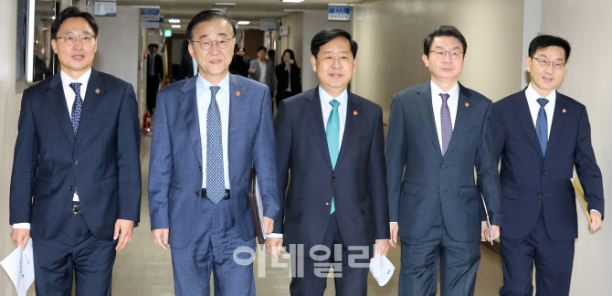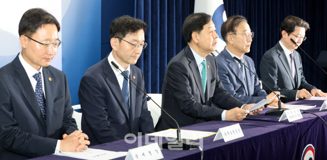 사지 왼쪽부터 임광현 국세청장, 윤창렬 국무조정실장, 구윤철 경제부총리 겸 기획재정부 장관, 김윤덕 국토교통부 장관, 이억원 금융위원장. |