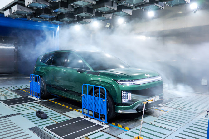 | | 환경시험동 강설챔버에서 아이오닉9 차량에 강설 시험을 하는 모습. (사진=현대차그룹) |