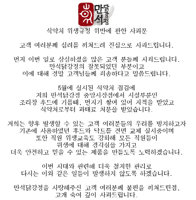 만석닭강정 측은 “5월에 실시한 식약처 점검에 저희 만석닭강정 중앙시장점에 시설 부분인 조리장 후드에 기름때, 먼지가 쌓여 있어 지적을 받았고 식약처로부터 과태료 처분을 받았다”면서 “향후 발생할 수 있는 고객 여러분의 우려를 방지하고자 기존에 사용했던 후드와 덕트를 전면 교체 실시 중이며, 또 직원 위생 교육도 강화해 모든 직원이 위생에 대해 경각심을 갖고 더욱 안전하고 믿을 수 있는 제품을 만들도록 노력하겠다”고 밝혔다.