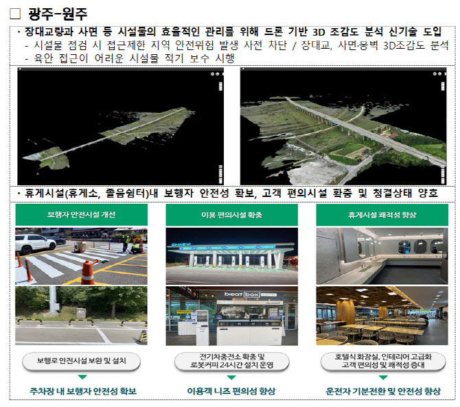 광주원주고속도로는 드론을 활용해 시설물을 점검, 보수하고 휴게소 내 안전시설을 설치해 보행자 안전성을 확보한 점이 높은 평가를 받았다.