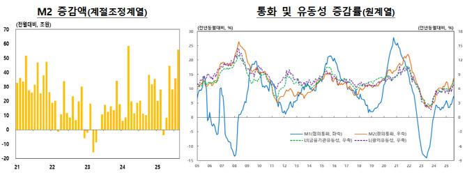 M2를 주체별로 보면 기업은 수익증권과 정기예적금 중심으로 25조 9000억원이 늘었다. 가계 및 비영리단체는 수익증권과 수시입출식 저축성예금 위주로 16조 9000억원 증가했다. 기타금융기관과 기타부문은 각각 10조 4000억원, 4조 6000억원 증가했다.