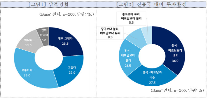 남북경협의 장점(복수응답)으로는 ‘인력 확보 용이성’이 25.1%로 가장 많았다. 이외에 △지리적 접근성(21.0%) △언어·문화 유사성(18.9%) △원자재·자원 확보 용이성(15.6%) 등의 응답이 뒤를 이었다.