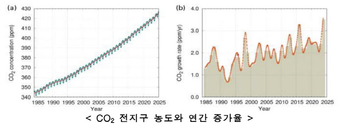 관측이 시작된 1957년 이후 매년 증가하고 있는 이산화탄소 농도는 2023~2024년 3.5ppm이 늘어 최대 증가 폭을 보였다. 역대 2위는 3.3ppm 증가한 2015~2016년이다.