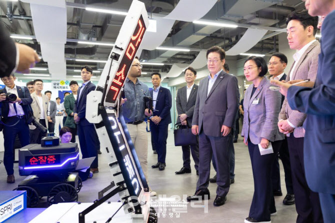 | | 이재명 대통령이 지난 9월 17일 경기도 성남시 스타트업 스퀘어에서 자율주행 순찰 로봇 시연을 지켜보고 있다. (사진=대통령실) |