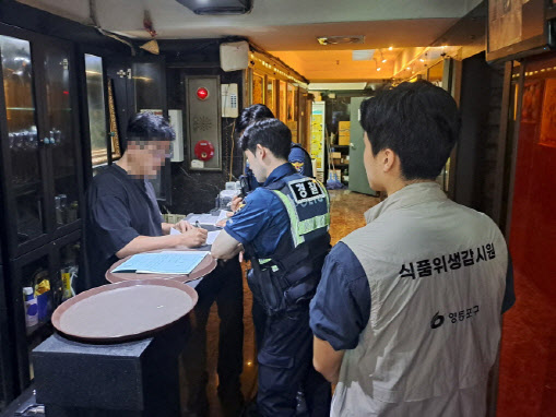 | | 경찰과 식품위생감시원 직원이 유흥업소를 대상으로 마약류 예방을 위한 특별 단속을 진행하고 있다.(사진=영등포구청) |