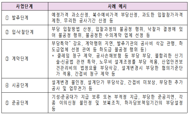 계약단계에서는 부당특약 강요, 계약행위 지연, 발주기관의 공사비 삭감 관행, 하도급업체 선정 관여 등이 있었고 시공단계에서는 설계변경 불인정, 설계단가 부당삭감, 간접비 미보상, 부당한 추가 공사, 업무전가 등의 문제가 있었다.