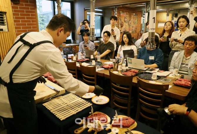 [이데일리 김태형 기자] 한우 명예홍보대사 김호윤 셰프가 24일 서울 강남구 서경한우프라자에서 열린 ‘한우 잇(EAT)다: 토종 한우로 색다른 맛을 잇다’ 미디어 설명회 및 시식회에서 시연을 하고 있다.