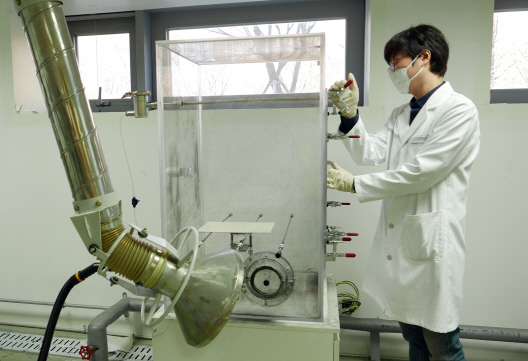 | | 아모레퍼시픽 ‘안티폴루션 연구센터’에서 미세먼지 대류 챔버를 통한 인공 피부 부착시험을 진행하고 있다. (사진=아모레퍼시픽) |