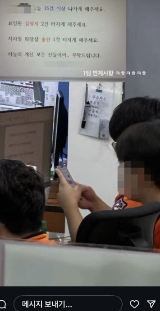 사진에는 소방복을 입은 인원 3명이 컴퓨터에 앉아있고 화면에는 ‘오늘 15건 이상 나가게 해주세요’, ‘요양원 심정지 2건 터지게 해주세요’, ‘지하철 화장실 출산 1건 터지게 해주세요’ 등 내용이 적혀 있었다.