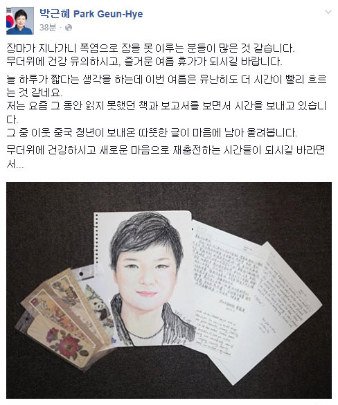 박 대통령은 이날 오후 페이스북에 “장마가 지나가니 폭염으로 잠을 못 이루는 분이 많은 것 같다”며, “무더위에 건강 유의하시고 즐거운 여름휴가 되시길 바란다”는 글을 남겼다.