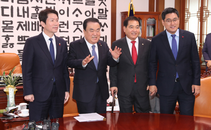 | | 문희상 국회의장(왼쪽 두 번째)이 지난 9일 오후 국회의장실에서 교섭단체 3당 원내대표 회동에 앞서 기념촬영을 하고 있다. 왼쪽부터 이인영 더불어민주당 원내대표, 문 의장, 심재철 자유한국당 원내대표, 오신환 바른미래당 원내대표. (사진=연합뉴스) |