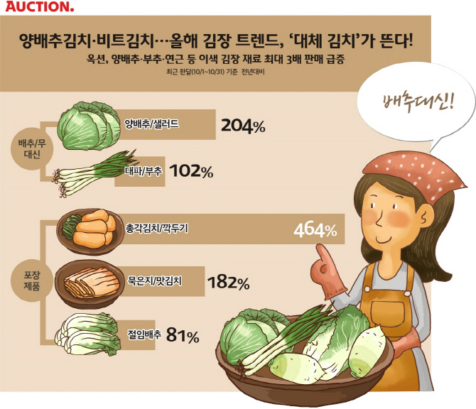 한편 옥션은 오는 13일까지 ‘김장하는 날’ 프로모션을 진행하고 김장 재료들을 최대 55% 할인 가격으로 선보인다. 대표 상품으로는 지정일에 예약 배송되는 ‘해남 절임배추 (2만5900원/20kg)’, ‘전라도 맛집 귀빈정 김치 양념(7900원/1kg)’ 등이 있다.