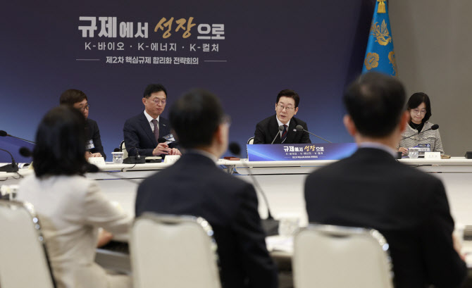 이 대통령은 이날 오전 용산 대통령실에서 제2차 핵심규제 합리화 전략회의를 주재했다. 제1차 회의에서 AI(인공지능) 데이터·자율주행·로봇산업의 핵심 규제를 다룬 데 이어, 이날 회의는 바이오·에너지·문화산업 등 미래산업의 핵심 분야를 중심으로 신성장 동력 확보를 위한 규제 혁신 방안을 논의하기 위해 마련됐다. 기업 대표와 학계 등 약 40여 명이 참석했다.