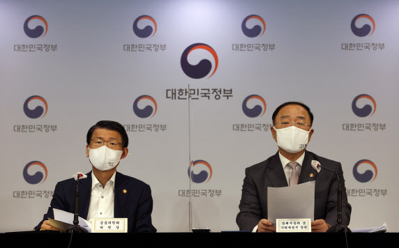 | | 홍남기 경제부총리 겸 기획재정부 장관(오른쪽)과 은성수 금융위원장이 3일 오후 정부서울청사에서 ‘한국판 뉴딜 금융지원 방안’에 대해 브리핑하고 있다. 연합뉴스 제공 |