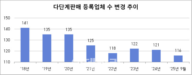 공정거래위원회가 30일 공개한 ‘2025년 3분기 다단계판매 주요정보 변경사항’에 따르면 지난 9월말 기준 다단계판매업 등록업체는 총 116개사로 전분기보다 1곳 줄었다.