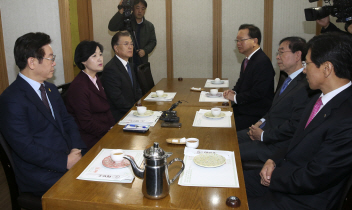 | | 8일 오전 서울 여의도의 한 식당에서 열린 더불어민주당 추미애 대표와 대선 예비주자의 ‘최순실 게이트’ 관련 정국 상황논의 모임에서 참석자 얘기를 나누고 있다. 이날 모임에는 이재명 성남시장, 문재인 전 대표, 추미애 대표, 김부겸 의원, 박원순 서울시장, 안희정 충남지사 등이 참석했다.(사진-연합뉴스) |