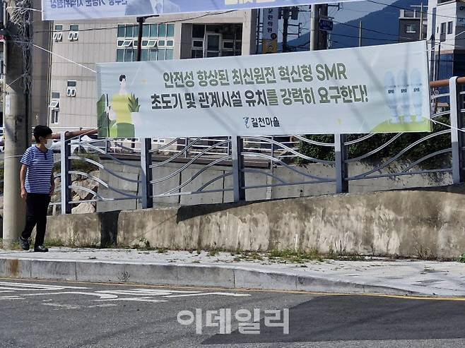 | | 길천마을 한 주민이 지난 1일 소규모모듈원전(SMR) 유치를 촉구하는 현수막을 걸어가고 있다. (사진=최훈길 기자) |