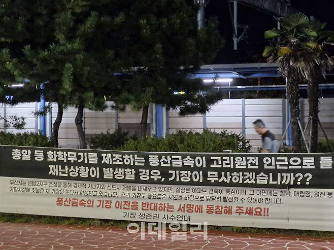 | | 1일 기장역 앞에 ‘재난상황이 발생했을 경우, 기장이 무사하겠습니까’라는 현수막이 걸려 있다. 원전 밀집 지역에 방산업체 풍산금속까지 이전하는 것에 대한 기장 주민들 반발이 거센 상황이다. (사진=최훈길 기자) |