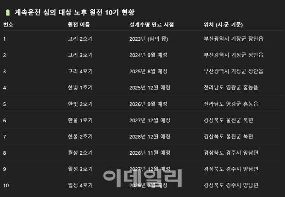 | | 고리 2호기 수명연장 여부는 이재명 정부의 원전 정책 향배를 가늠하는 시금석이 될 전망이다. 전국 곳곳의 9개 노후 원전(전남 영광 한빛 1·2호기, 부산 고리 3·4호기, 경북 울진 한울 1·2호기, 경북 경주 월성 2·3·4호기)의 수명연장 여부에도 영향을 끼칠 것으로 보이기 때문이다.(자료=원자력안전위원회) |