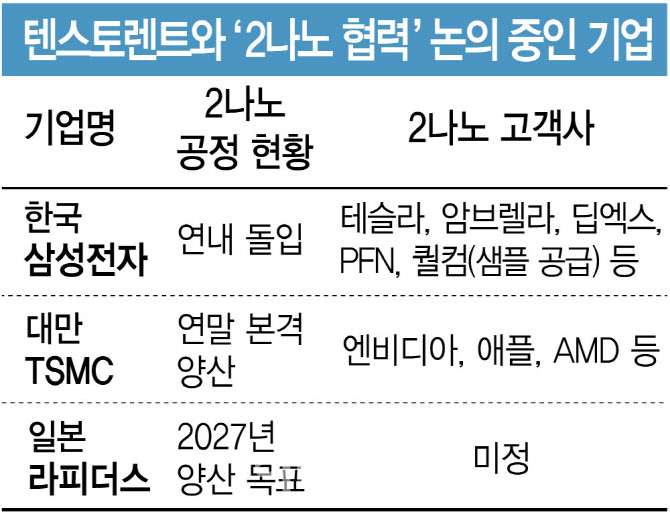 15일 업계에 따르면 켈러 CEO는 최근 닛케이아시아와 인터뷰에서 “우리가 출시할 2나노 AI 칩 개발을 위해 삼성전자와 논의하고 있다”고 밝혔다. 텐스토렌트는 삼성전자 외에 세계 최대 파운드리 TSMC, 일본 라피더스와도 협력을 논의하고 있다고 덧붙였다. 라피더스는 토요타, 키옥시아, 소니, NTT, 소프트뱅크, NEC, 덴소, 미쓰비시UFJ은행 등 일본 대기업 8곳이 2022년 설립한 회사다.