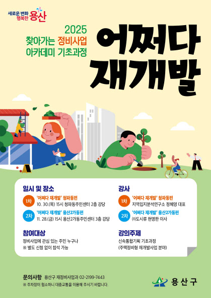 [이데일리 이영민 기자] 서울 용산구가 구민을 대상으로 ‘2025 찾아가는 정비사업 아카데미 기초과정: 어쩌다 재개발’을 운영한다고 28일 밝혔다.