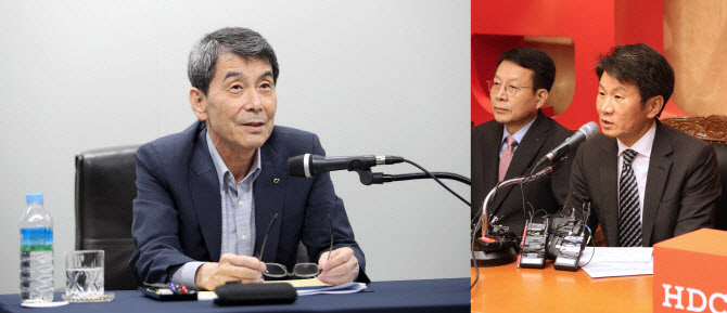 | | 이동걸 KDB산업은행 회장(왼쪽)과 정몽규 HDC현대산업개발 회장(오른쪽)(사진=연합뉴스) |