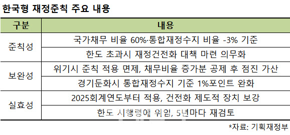 코로나19 같은 심각한 국가적 재난이나 경제위기 발생 시 재정준칙을 적용하지 않는 예외조항을 두기로 했다. 경기둔화가 우려되면 통합재정수지 기준을 -3%에서 -4%로 느슨하게 적용하기로 했다. 기재부는 올해 연말에 이같은 내용을 담은 국가재정법 개정안을 국회에 제출하되, 수량적 한도 규정은 시행령에 위임하기로 했다.