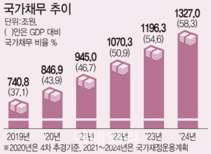 | | 국가채무는 문재인정부가 출범한 2017년 660조2000억원에서 집권 마지막 해인 2022년에 1070조3000억원으로 5년새 410조1000억원 증가할 전망이다. 2020년은 4차 추경 기준, 2021~2024년은 2020~2024년 국가재정운용계획 기준, 괄호안은 국내총생산(GDP) 대비 국가채무 비율. 단위=조원, % [자료=기획재정부] |
