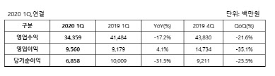 웹젠은 1분기 중 갑작스러운 코로나19의 확산으로 국내외에서 사업활동이 위축됐고, 3월 말 출시한 웹게임 외에 신작게임의 출시가 없어 매출이 하락했다고 설명했다. 신작 모바일게임이 출시되는 2분기부터는 상승 전환을 기대하고 있다.