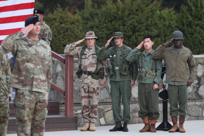 | | 26일 경기도 동두천시 캠프 케이시에서 열린 주한 미 2사단 100주년 기념 재입대식에서 옛 미군 전투복을 입은 장병이 국민의례를 하고 있다. [사진=연합뉴스] |