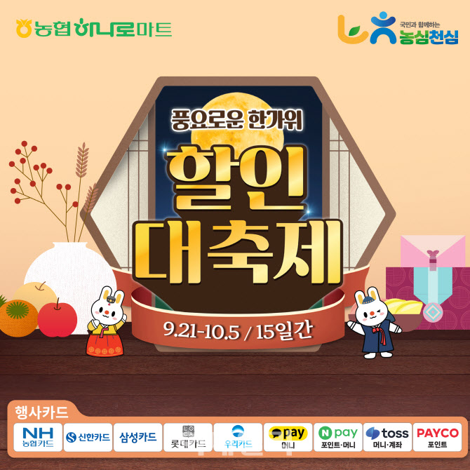 박서홍 농업경제대표이사는 “추석을 앞두고 다양한 혜택을 통해 소비자의 장바구니 물가 부담을 덜어드리고자 한다”면서 “우리 농축산물과 함께 풍요롭고 즐거운 한가위를 보내시길 바란다”고 전했다.