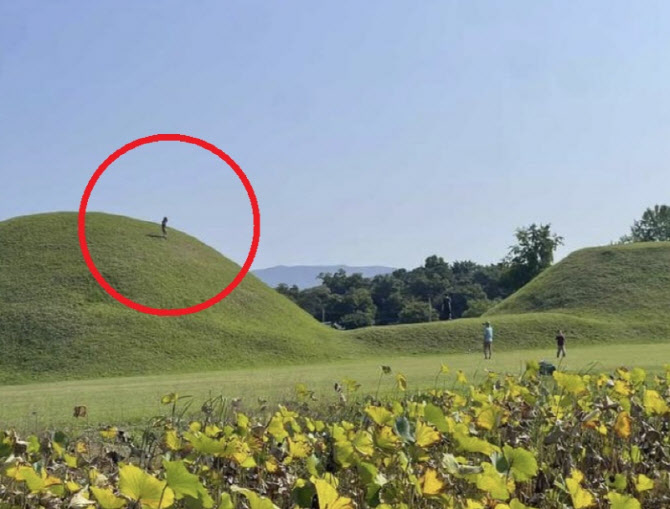 주민 A씨가 올린 ‘아이는 능 위로, 아빠는 촬영 중…경주 신라 고분 훼손 논란’이라는 제목의 게시글에는 고분 맨 위까지 올라가 있는 아이와 보호자로 추정되는 한 남성이 아이의 모습을 휴대전화로 촬영하고 있는 모습이 담긴 사진 한 장이 공개됐다.