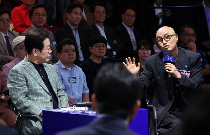 | | 이재명 대통령과 홍석천이 14일 서울 동대문구 콘텐츠문화광장에서 열린 디지털 토크라이브 행사에 참석해 대화를 나누는 모습. (사진=연합뉴스) |