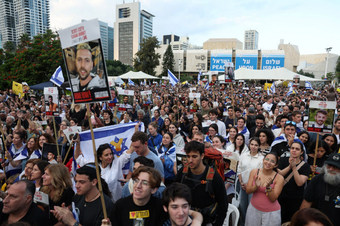 | | 지난 13일(현지시간) 이스라엘과 하마스 간 포로-인질 교환 및 휴전 협상의 일환으로 팔레스타인 가자지구에 억류된 이스라엘 인질들의 귀환을 기다리는 시민들이 모여있다. (사진=로이터) |