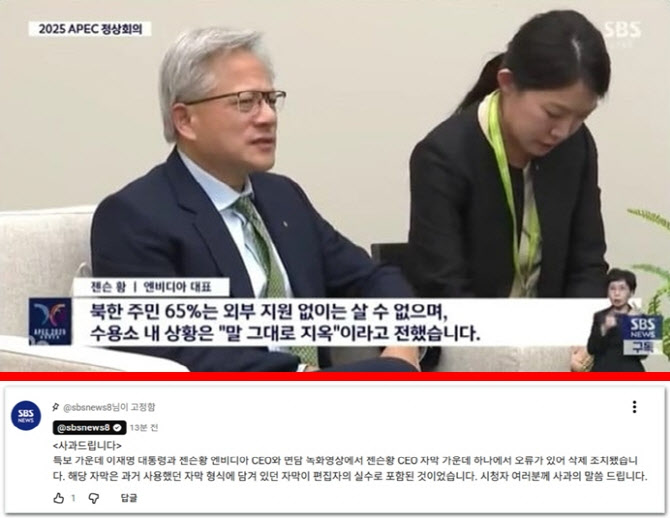 SBS 뉴스는 지난 1일 ‘뉴스특보 - APEC 2025 정상회의’ 방송 도중 전날 젠슨 황 CEO와 이 대통령 면담 소식을 전했다. 당시 젠슨 황 CEO 발언 장면에는 “북한 주민 65%는 외부 지원 없이는 살 수 없으며 수용소 내 상황은 ”말 그대로 지옥“이라고 전했습니다”라는 자막이 송출됐다.